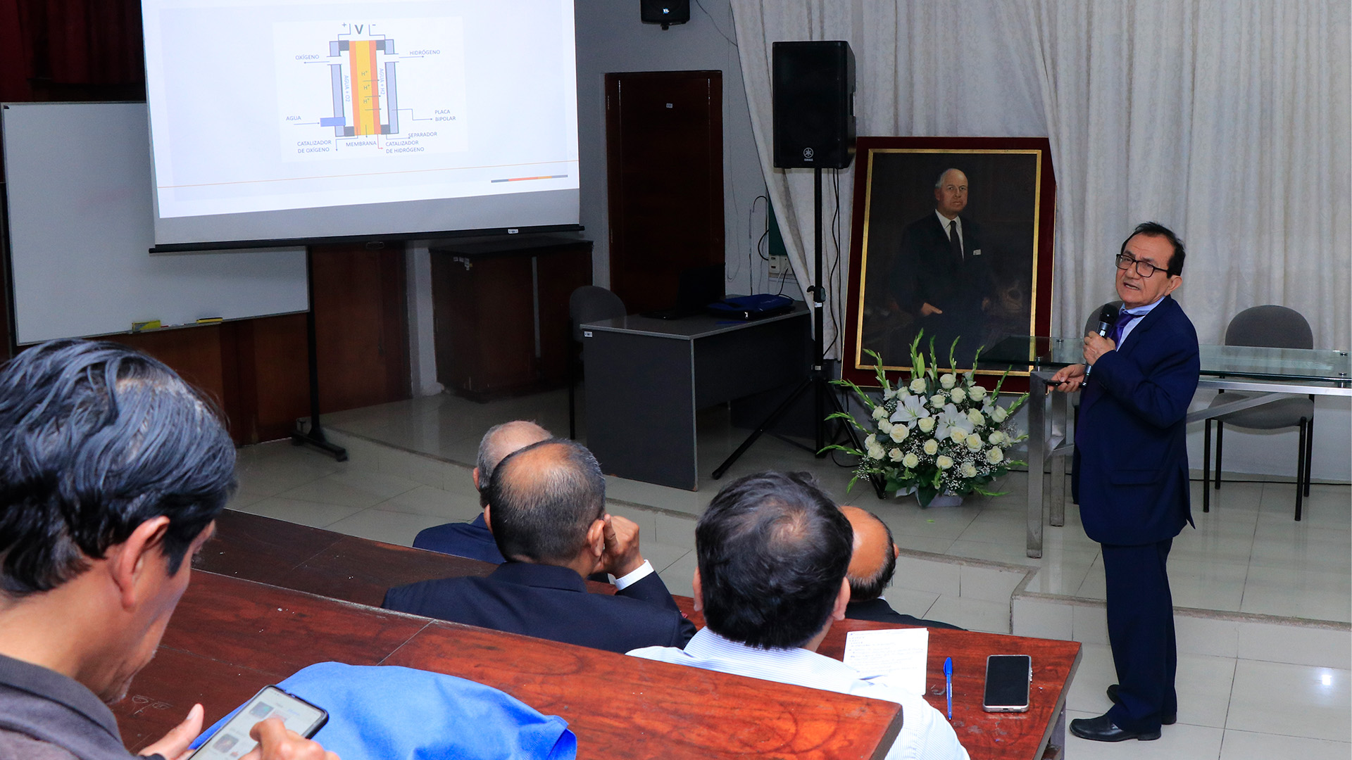 En el auditorio de la FIGMM, la máxima autoridad de la UNI inició su conferencia destacando la ciencia y la tecnología desarrolladas en la universidad para la producción de hidrógeno a partir de emisión cero de carbono. Es decir, precisó, con base en el uso de la electrólisis con corriente eléctrica renovable (eólica, fotovoltaica o hidráulica).