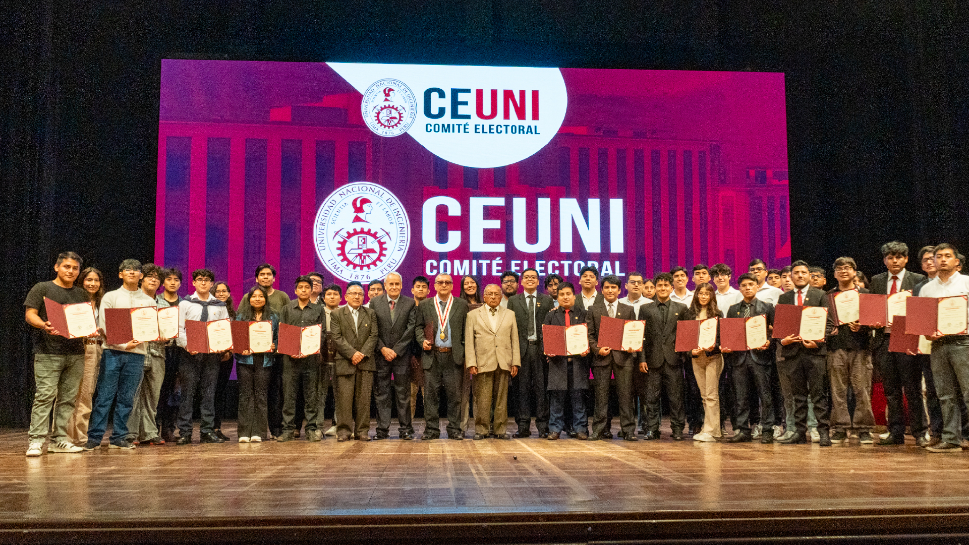 La ceremonia contó con la presencia del rector de la UNI, Dr. Arturo Talledo Coronado, el vicerrector académico y de investigación, Dr. Jorge Gustavo Burler Blacker, el presidente del Comité Electoral Universitario, M.Sc. Eliseo Páez Apolinario, los vocales Ing. Manuel Sebes Toledo Paredes y Mag. Carlos Alberto Huayllasco Montalva, y el secretario, estudiante Enrique Israel Marín Ríos. Las autoridades destacaron la transparencia y el cumplimiento de las normas que rigen los procesos electorales en la universidad.